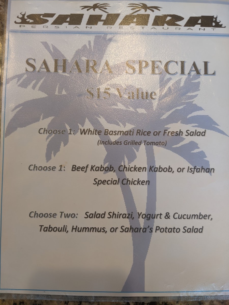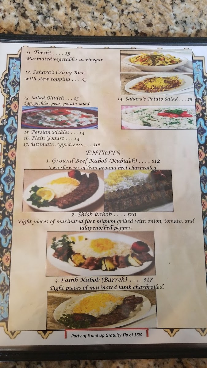 Welcome to Sahara Mediterranean Restaurant, a hidden gem located in the heart of Dallas, Texas. Renowned for its authentic Persian cuisine, Sahara’s menu is a delightful journey through Mediterranean flavors. Start your meal with dazzling appetizers such as Hummus and Kashk Bademjan, followed by the exquisite range of entrees including tender Lamb Kabob and succulent Chicken Barg.